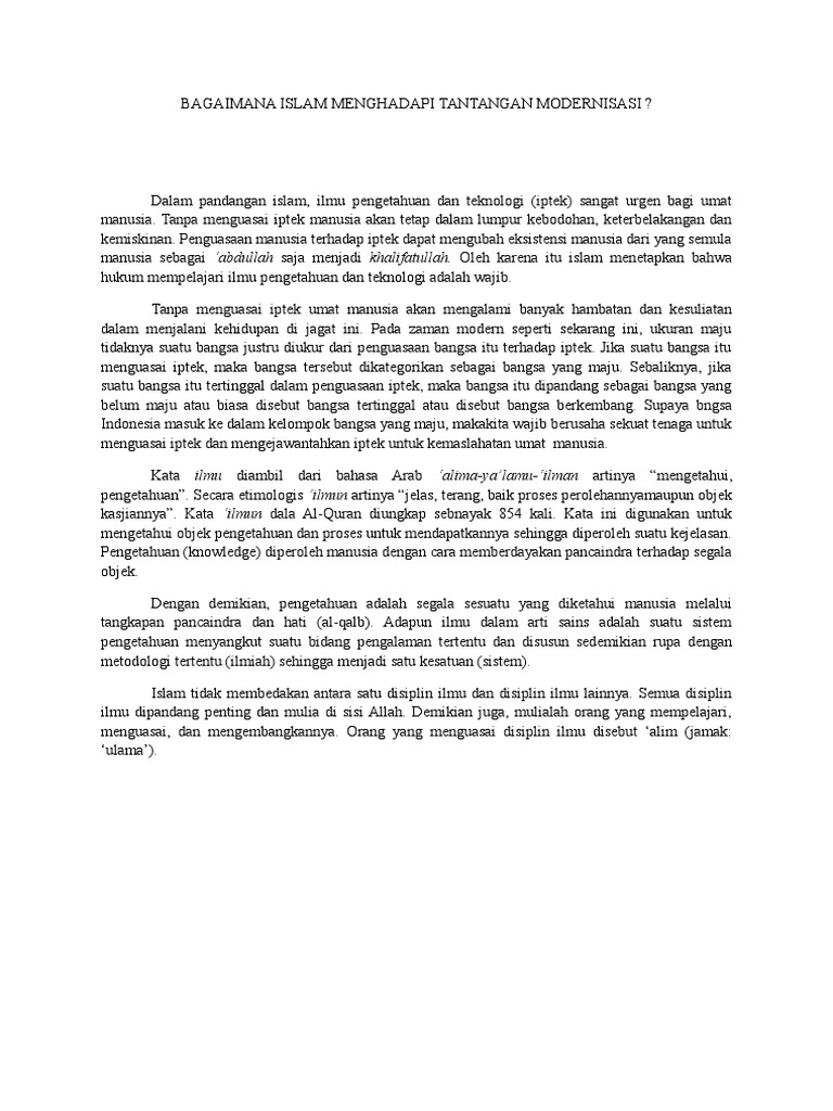 Download Bagaimana Islam Menghadapi Tantangan Mendeskripsikan Esensi dan Urgensi Kontekstualisasi Pemahaman Islam Dalam Menghadapi Tantangan Modernisasi Perlu .Secara teologis. Pada posisi ini Islam adalah pandangan dunia weltanschaung yang memberikan kacamata pada m.ia dalam memahami realitas. Ekonomi. Islam merupakan .MASYARAKAT ISLAM DAN TANTANGAN MODERNISASI. serta bentuk Islam yang bagaimana yang harus ditampilkan Sikap Umat Islam dalam Menghadapi Modernisasi..Bagaimana pandangan Islam tentang ekonomi? Menurut AM Saefudin ada enam pokok perekonomian . Barang dan jasa yang diproduksi. . Sistem produksi yang akan .BAGAIMANA ISLAM MENGHADAPI TANTANGAN MODERNISASI ? Dalam pandangan islam, ilmu pengetahuan dan teknologi iptek sangat urgen bagi umat m.ia..Tantangan Pendidikan Islam di Era Modernisasi dan Globalisasi D. Bagaimana Pendidikan Islam di Era umat Islam belum menghadapi ancaman yang serius dari .